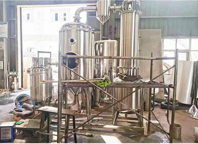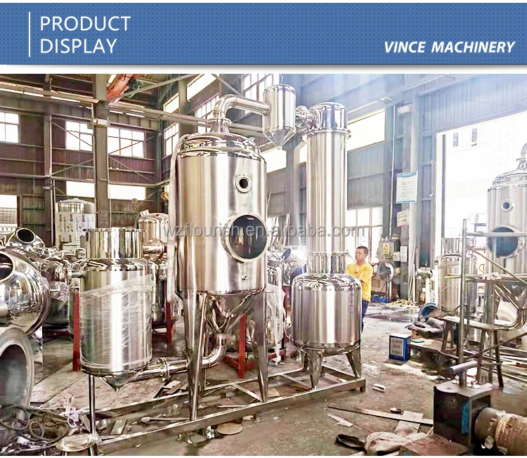 2.Liquid concentration: The equipment adopts external heating natural cycling mode and vacuum negative pressure evaporating mode, with instant evaporation and great concentrated specific gravity up to 1.4. The liquid materials are concentrated without foam under the completely sealed status. The liquid medicine concentrated from the equipment has no pollution, and has strong flavor of medicine.