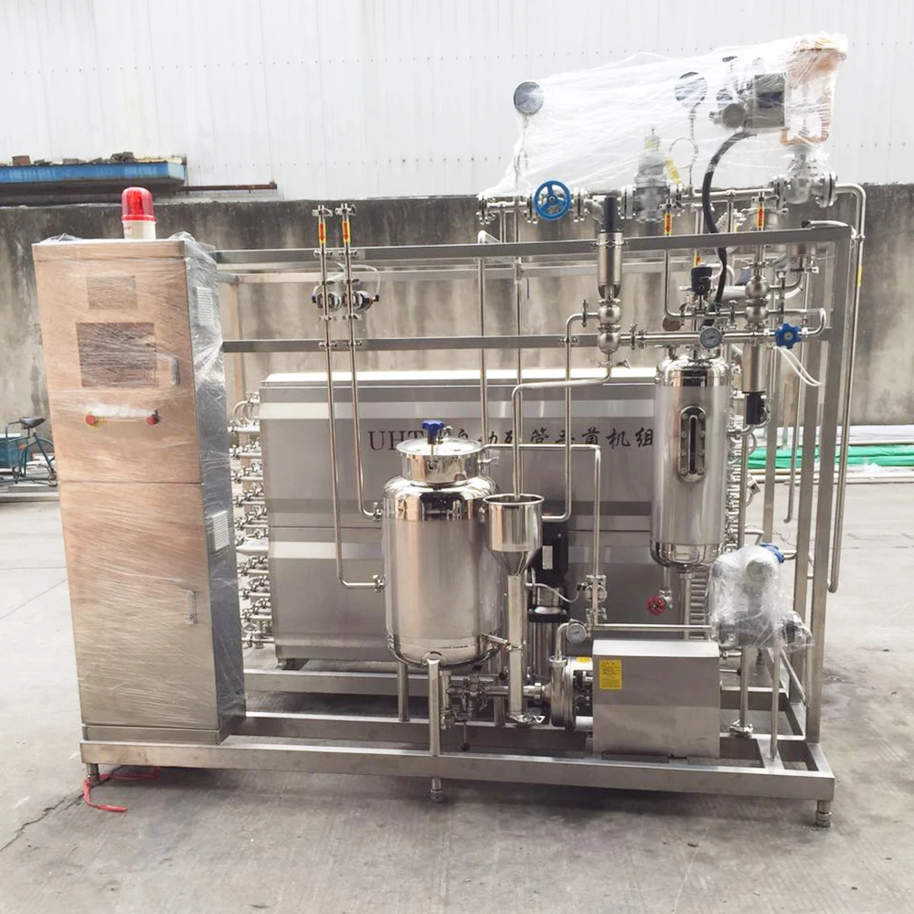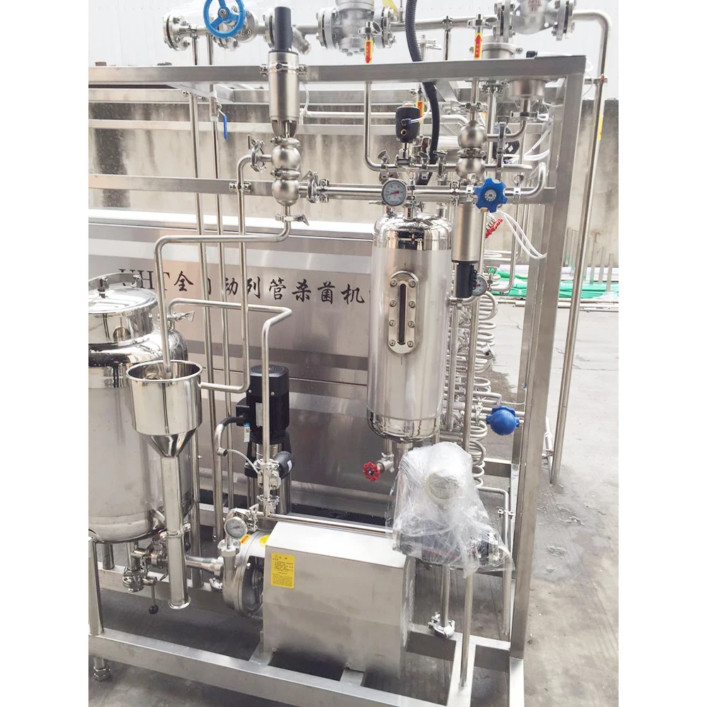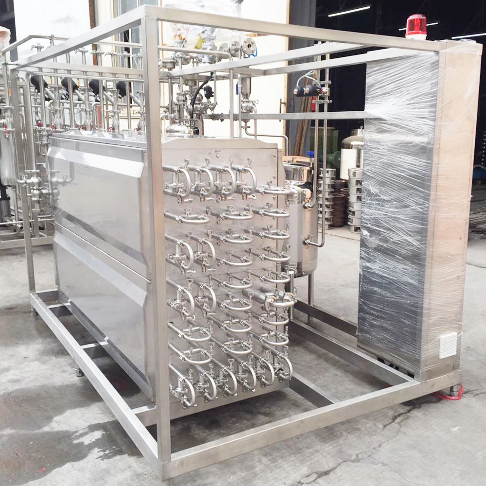 Tubular sterilizer is mainly used for heat treatment of various dairy products, fruit juices, beverages, molasses, soy sauce, wines, vinegar and liquid medicine. The equipment is mainly composed of steam system, material system, hot water system, cooling system, etc. And all parts have been assembled together, making the result compact, small footprint, easy to transport and install. The characteristics of tubular sterilizer are that it can be equipped with human-machine operation interface, which is simple to operate: high degree of automation: semi-automatic or full-automatic PLC and touch screen interface are used for the whole system control. The human-machine interface is simple and easy to understand. Just press the start button, and the whole process from CIP cleaning of equipment, automatic sterilization of equipment to sterilization of materials (milk) realizes full automatic control. No other auxiliary operation is required.