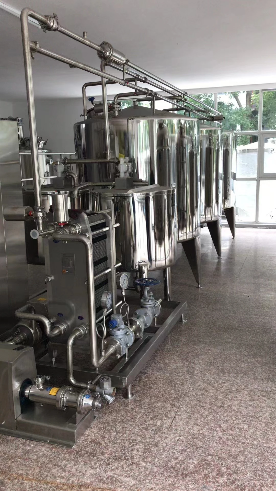 1)CIP cleaning system is composed of acid tank, alkali tank, hot-water tank, pure-water tank, back-water tank, thick-acid tank, thick-alkali tank, heat exchanger, pumps peripheral valves and pipes.
